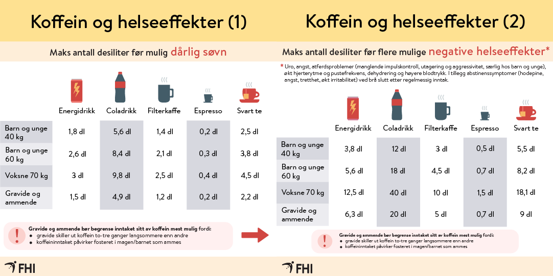 Kaffe og energidrikk har et relativt høyt innhold av koffein, og selv en enkelt boks med energidrikk kan gjøre at enkelte får et inntak som gir økt risiko for dårligere søvn eller andre negative helseeffekter. Under kan du se noen eksempler på hva grensene som er satt for maksimalt inntak betyr omsatt i mengde kaffe og energidrikk for ulike grupper i befolkningen.
